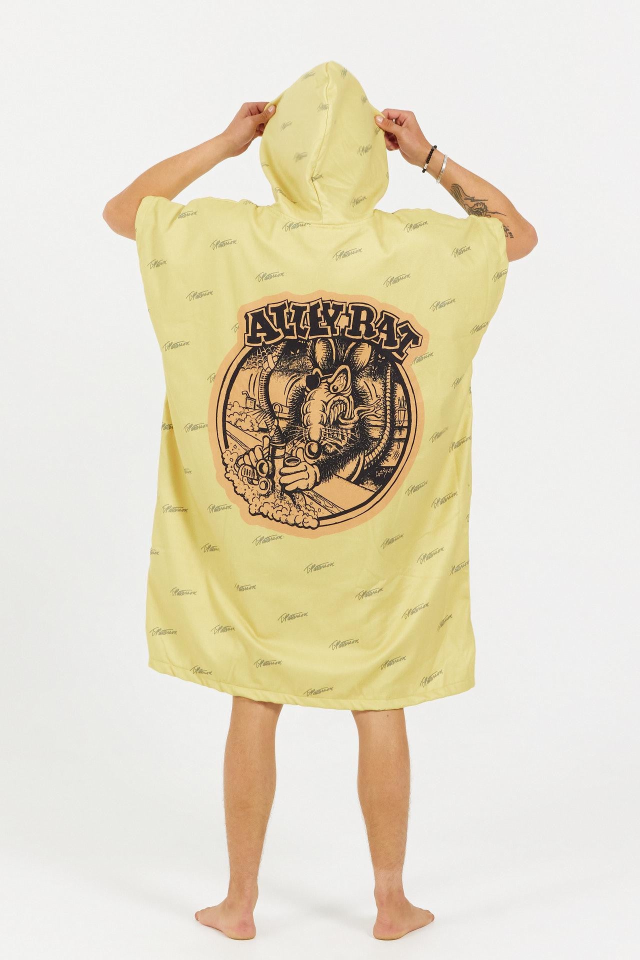 With this collaborative poncho, we’re taking you with us on a journey into Alley Rat, the shaping street of San Clemente, where Timmy has been meticulously crafting boards for over 40 years. The poncho’s patterns are inspired by the graphics of his latest high-performance board model, which carries the same name as the famous alleyway.