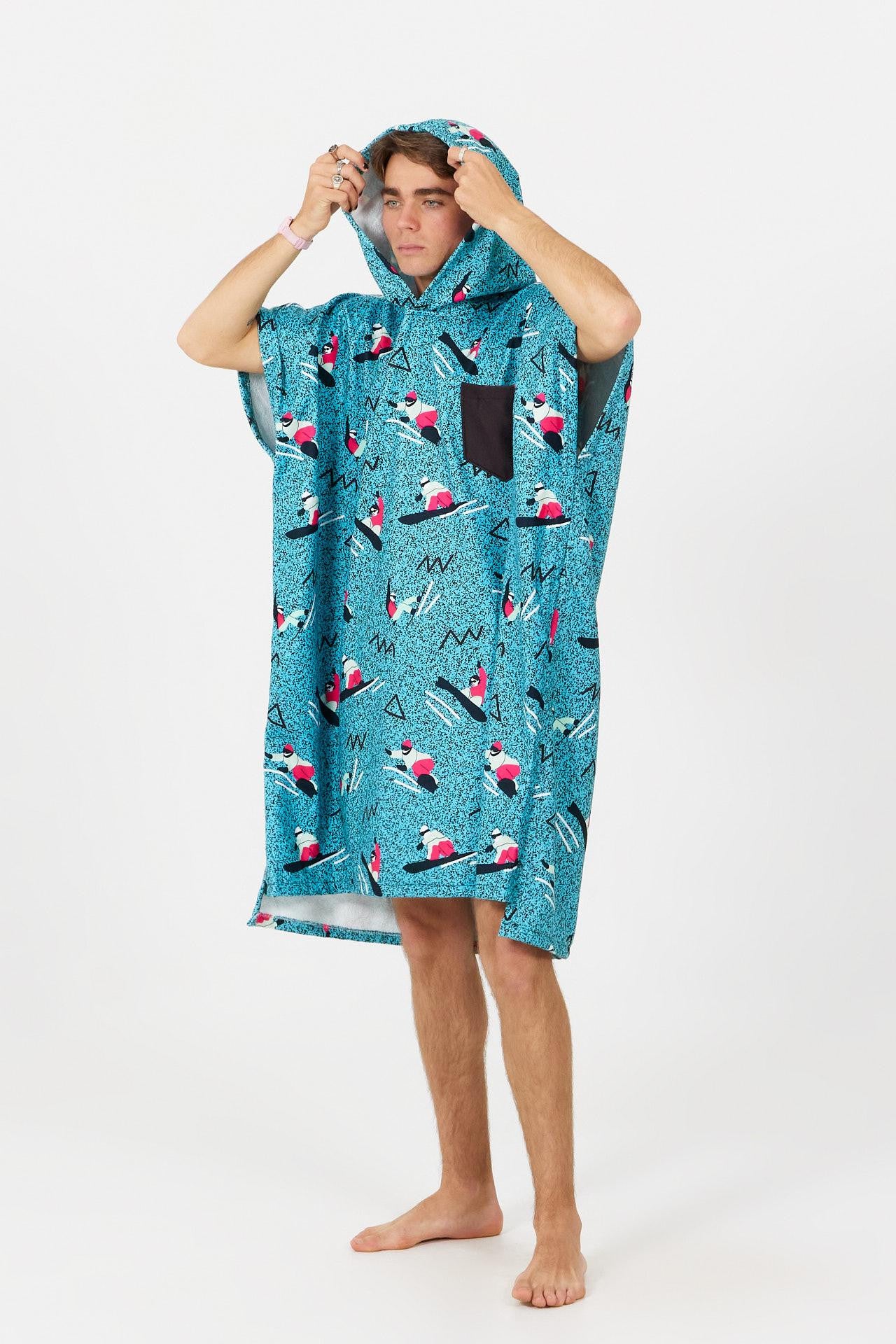 A throwback to the 90s with this poncho featuring graphics inspired by old-school snowboarding: bold colours, geometric shapes and a full freestyle vibe. A clear nod to the riders of the golden era.