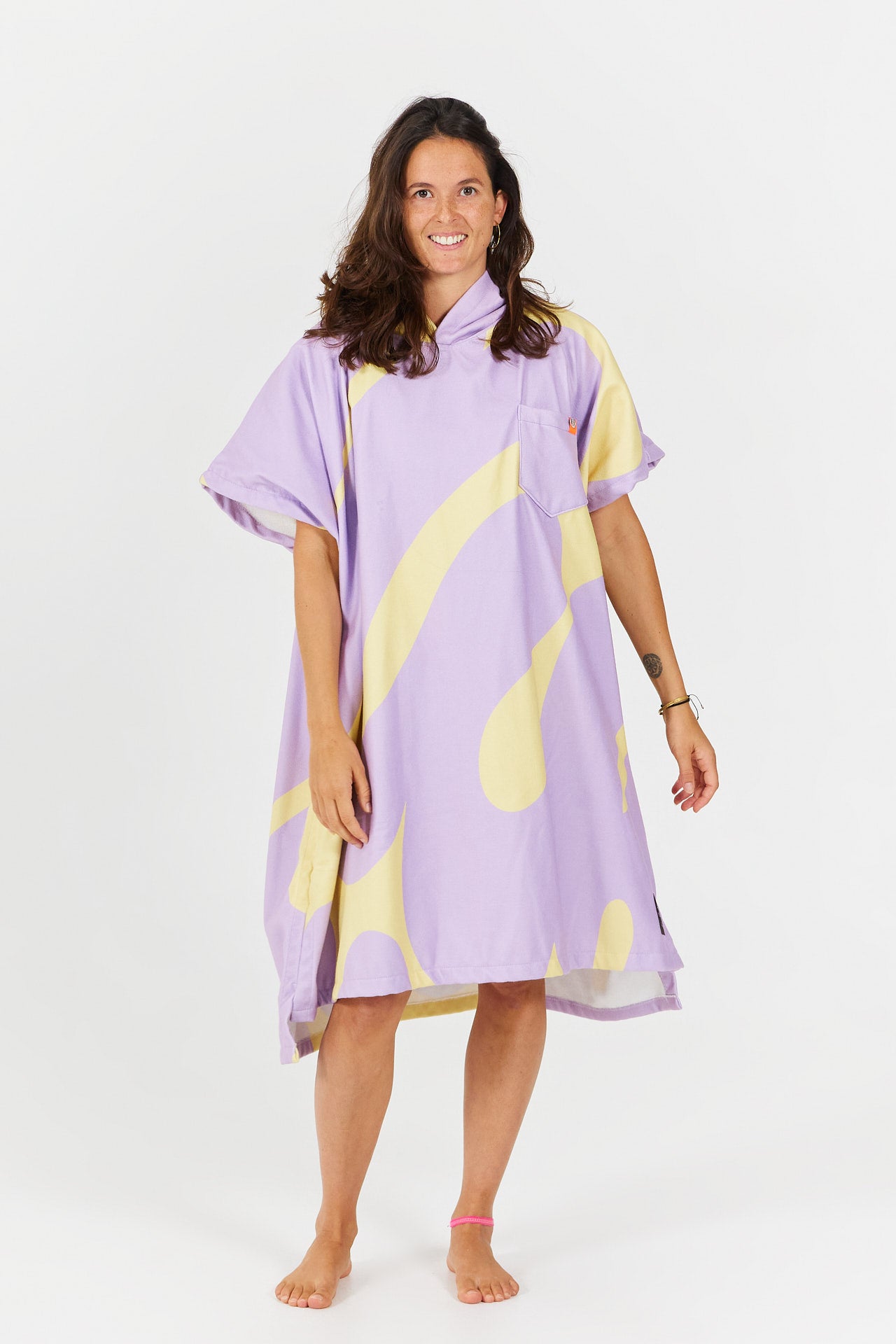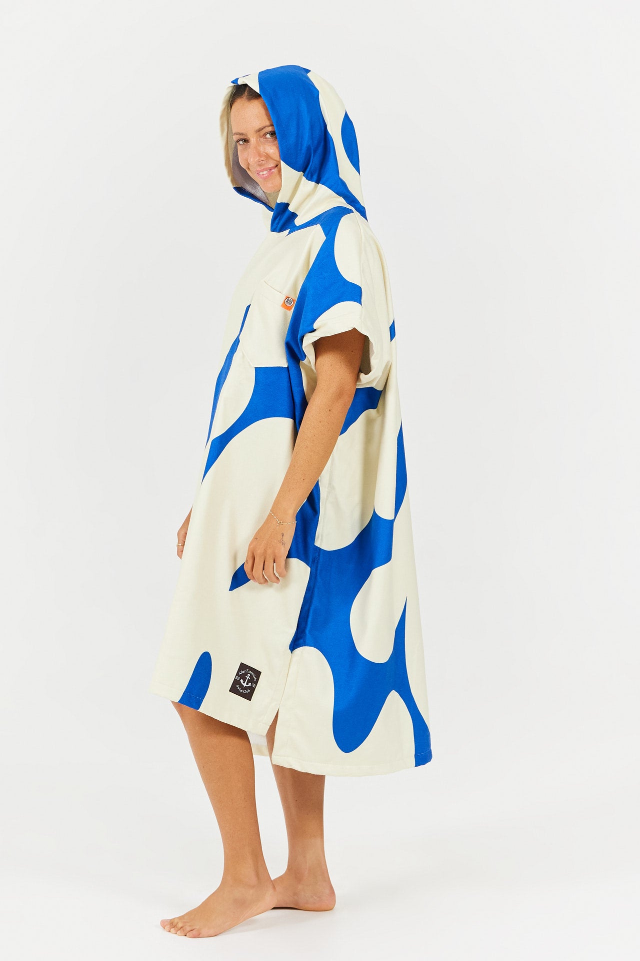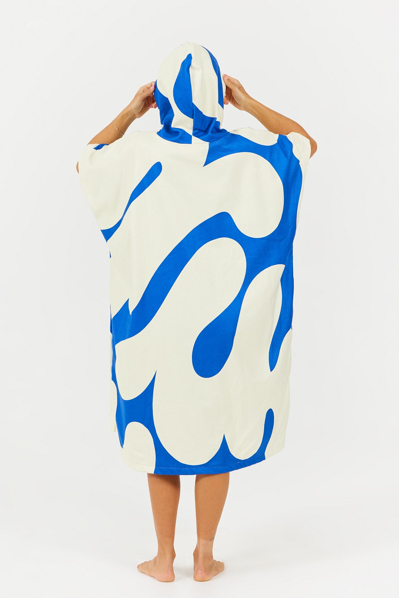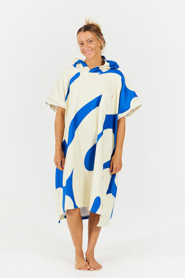 Inspired by the sport of diving, the Splash poncho features stylized splash patterns, evoking the movement of water and the refreshing feeling of sunny swims.