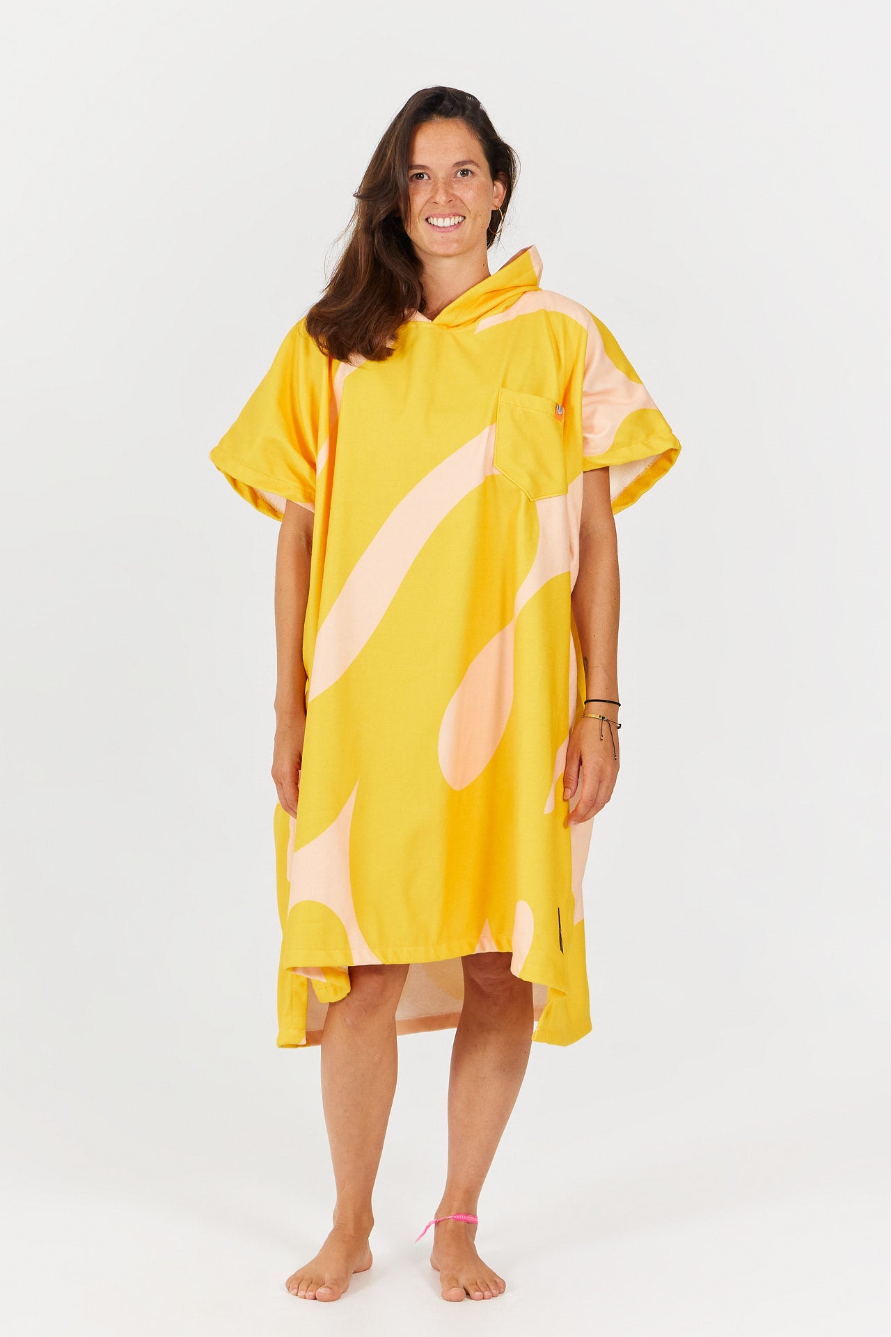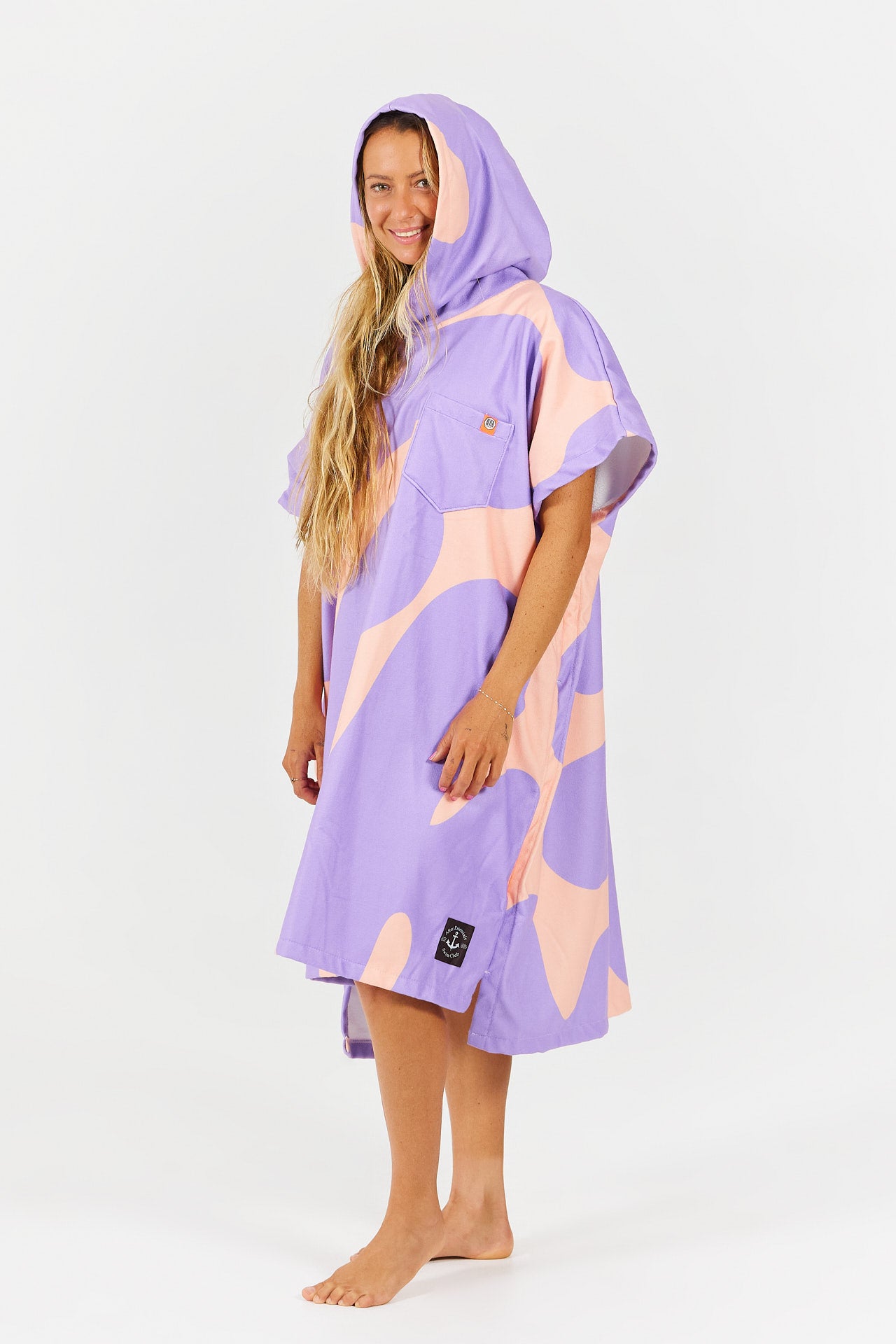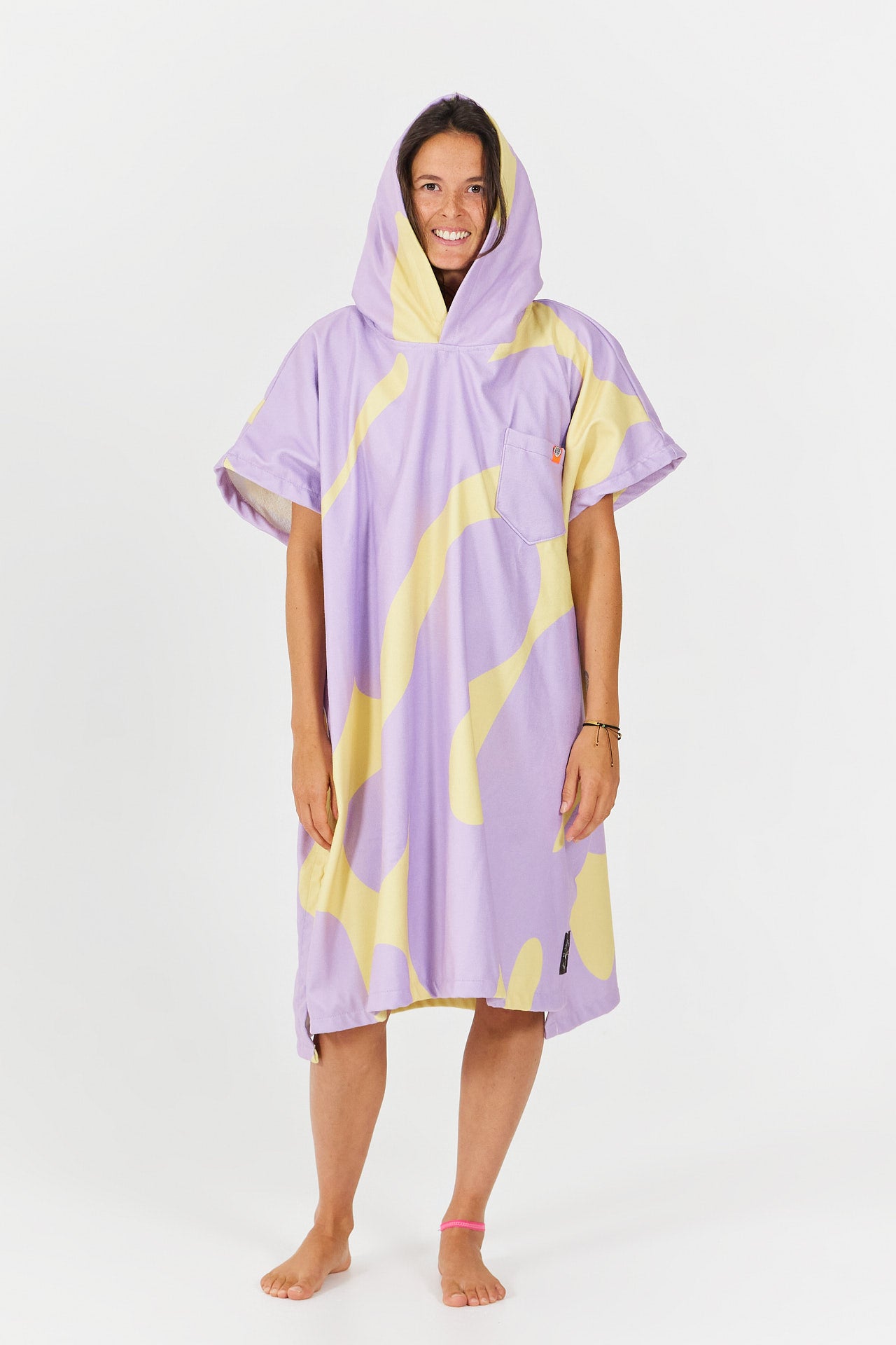Designed for quick drying and optimal comfort, it combines a 100% cotton inner terry with a durable polyester outer layer. Its loose fit and side openings make it easy to put on while allowing full freedom of movement. The generous integrated hood protects against the wind and helps dry your hair, while the chest pocket with cord keeps your essentials close at hand.